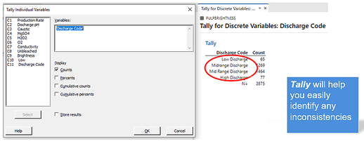 使用“统计”>“表格”>“Tally单个变量”,可以在“Minitab”输出窗格中查看值和相应计数的列表。您还可以选择将结果存储在Minitab工作表中,如果您计算使用转换表重新编码个或以上的值,这将有用!