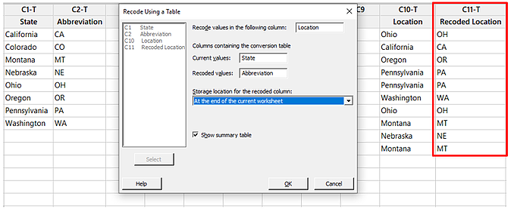 Minitab的“数据”>“重新编码”菜单可用于重新编码值以纠正输入错误或将数字重新编码为文本数据,当需要重新编码个以上的值时,转换表可以通过帮助。