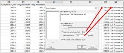 使用数据>堆叠>列将多个列彼此堆叠在新列中。