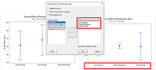 右键单击文本数据的列,然后选择“列属性”>“值顺序”以选择文本列的顺序。Minitab使用字母顺序作为默认顺序;但是,您可以按照对您的分析合理的方式来更新。
