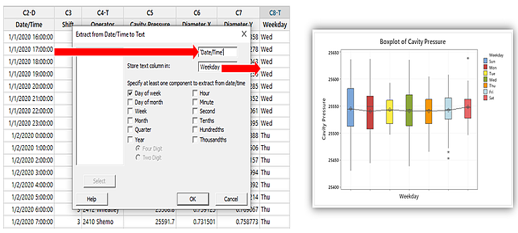 使用数据>日期/时间>提取到文本来创建新列,以显示星期几。这提供了种方式来创建分组列以进行分析,例如,可视周变化。
