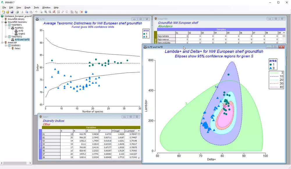 该工具主要面向生态数据(包括基础研究、环境调查及生物监测中的物种丰度数据,如计数、生物量、覆盖度或存在/缺失数据),虽然主要针对生物群落数据设计,但同样适用于其他类型的多元数据,例如遗传核苷酸(如SNPs)、等位基因频率、氨基酸或蛋白质数据。PRIMER还能处理理化变量数据,既可单独分析这些参数,也能探究生物变化与理化条件之间的协同变异。