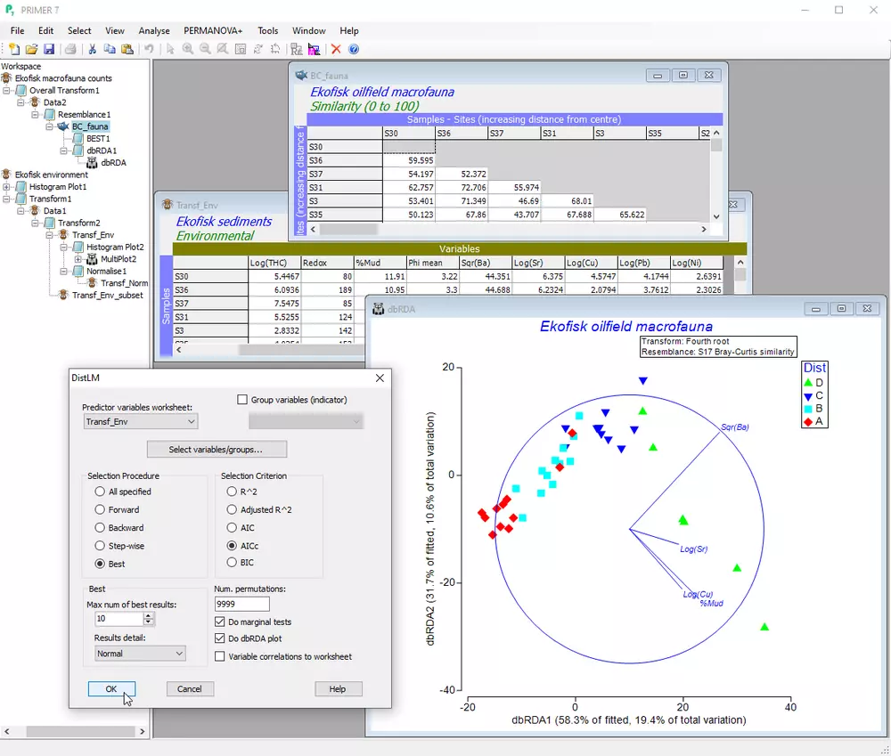 更重要的是,通过PERMANOVA+模块,研究人员能够基于多因子抽样设计、复杂实验和/或环境梯度来分析多元(或单变量)变异。该工具直接在选定的相似性度量空间中构建数据分布云,保持了基础分析的灵活性。通过精准构建相关检验统计量与先进的置换算法,实现了无需分布假设的统计推断。