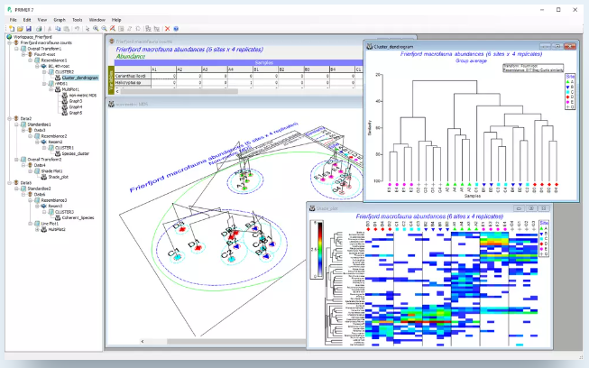 PRIMER 7结合PERMANOVA+软件,为多元数据分析(特别是群落生态学中的物种-样本数据)提供了丰富的图形化和分析流程。该软件几乎适用于所有多元数据集的分析,其核心特性在于能够将数据简化为合适的样本间相似性三角矩阵,进而通过聚类排序技术直观展示样本关联关系,并采用稳健的置换检验进行假设验证。