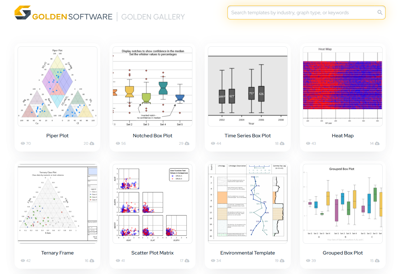 Grapher Beta 中的"Golden Gallery"包含一系列可直接用于发表的模板,您可以浏览、自定义和重复使用。