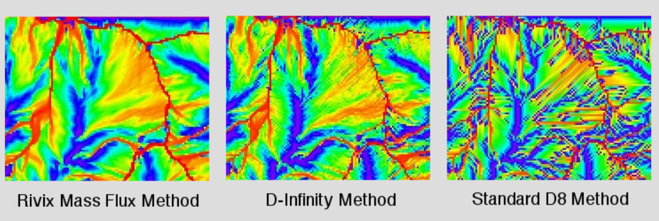 Rivix 软件开发的用于计算收敛和发散地形下的总汇水面积和单位汇水面积的"质量通量法",可以说是计算这些量的终 极算法。该算法基于计算流体动力学概念,性能显著优于其他方法,如有名的 D8 和 D-Infinity 算法。在 RiverTools 4.0 中,此算法进一步改进,以处理在极少数情况下可能出现的一些特殊情况。