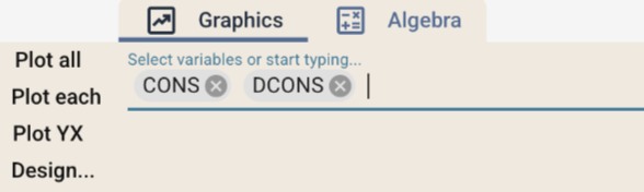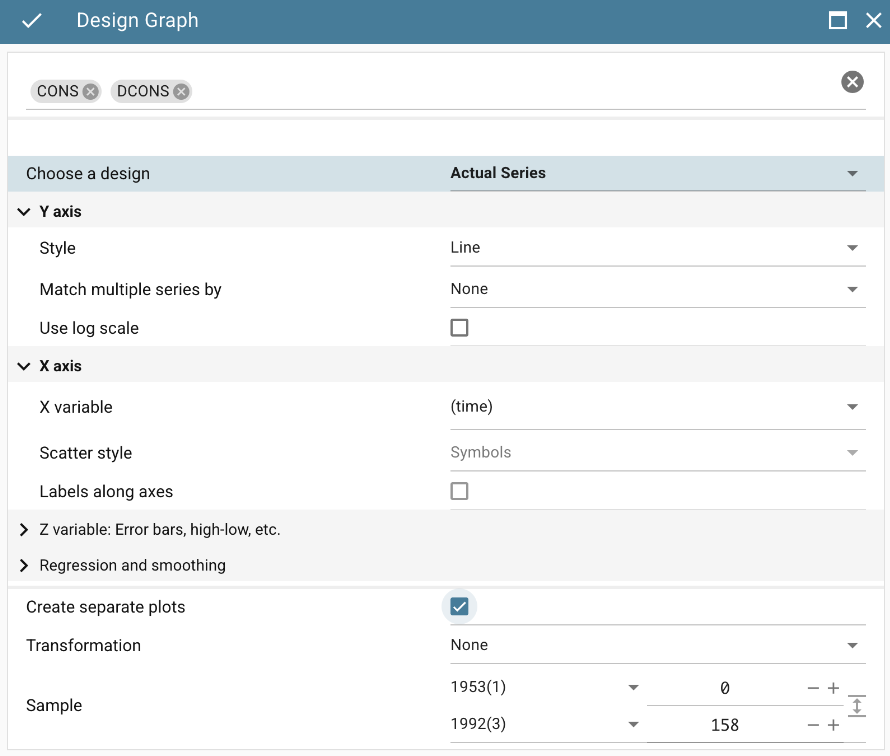 用户需在图形选项卡中点击“选择变量”字段,选定 CONS 与 DCONS 后进入“设计”菜单。勾选“创建单独图形”选项,即可为每个变量生成各自的时间序列走势图。