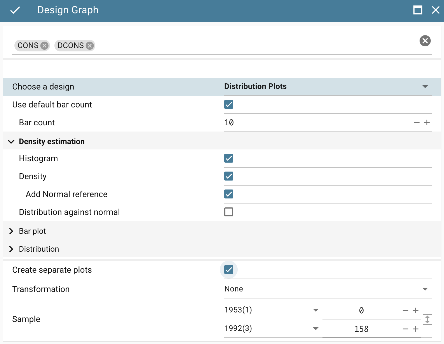 在第三步中,同时选中 CONS 与 DCONS,再次进入“设计”下拉菜单并选择“分布图”。勾选“直方图”、“密度曲线”及“添加正态参考线”,并确保勾选“创建单独图形”以使两个变量分开展示。