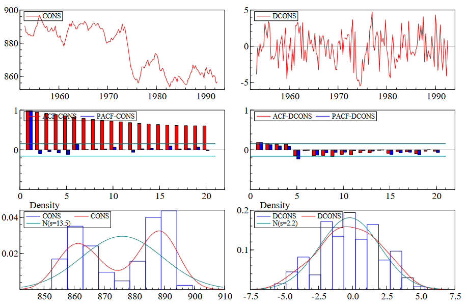 OxMetrics 软件在其官方使用指引中,系统介绍了描述性统计图形的生成流程。该教程以变量 CONS 和 DCONS 为例,展示了如何通过图形设计界面快速产出时间序列图、自相关图、偏自相关图及带有正态参考线的分布直方图。