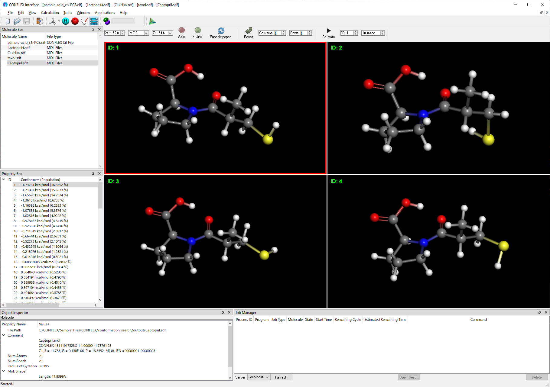 CONFLEX permits fast, accurate, automated conformation searching and analysis critical to drug discovery and chemical engineering. Unique to CONFLEX is its capability to completely search the conformational space of a flexible molecule to find every optimal structure of chemically significant conformers. CONFLEX is not limited to finding only locally-optimized structures that depend on an initial structure input by the user.